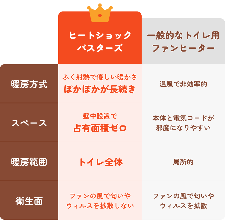 特殊和紙ヒーターパネルはわずかな電力で遠赤外線ふく射熱を発するため、その他の暖房器具と比べて超省エネ。トイレの一般的なファンヒーターと比べても、消費電力ごくわずか!
