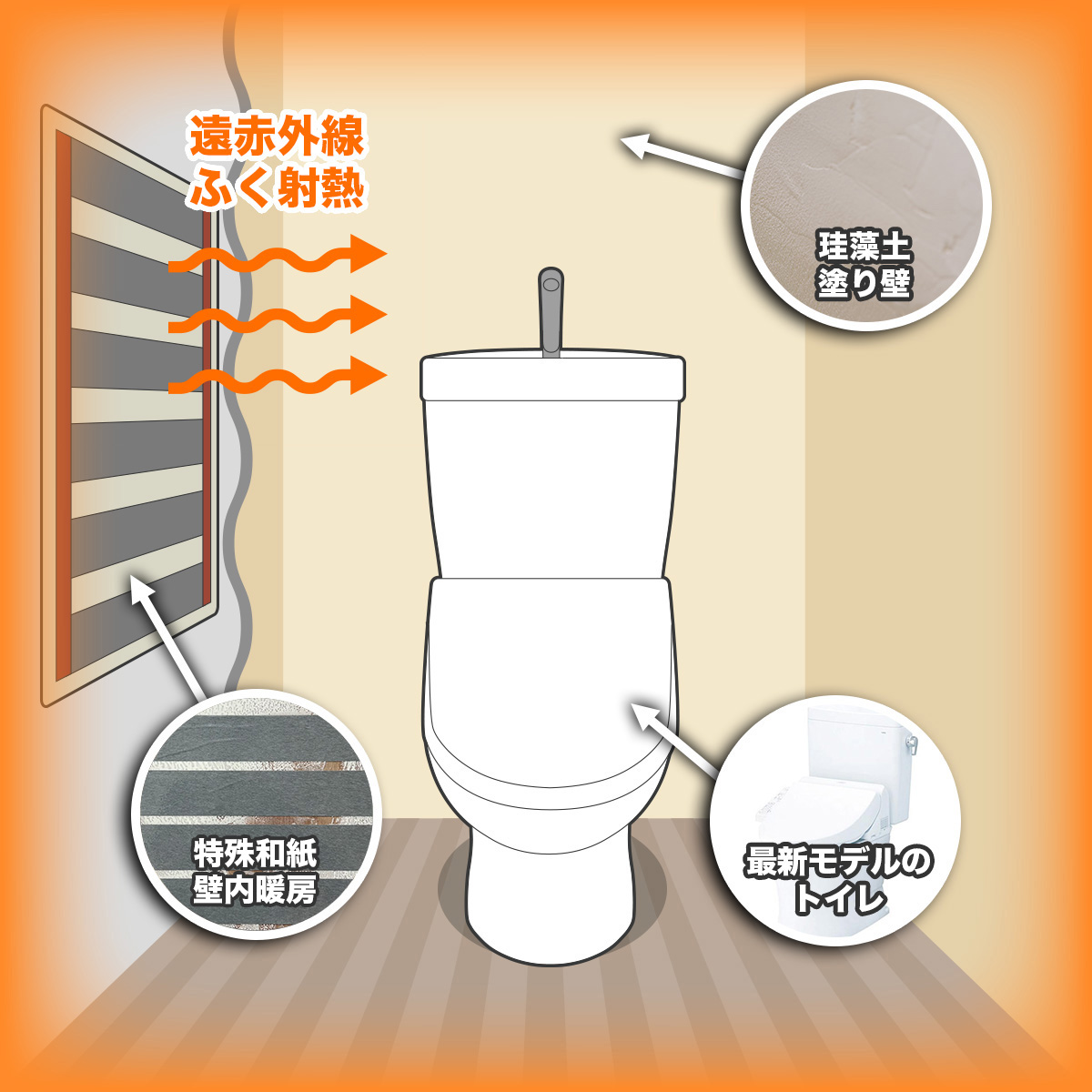 まず特殊和紙ヒーターを活用した埋め込み型の壁暖房システムが超省エネながら遠赤外線ふく射熱でトイレをじんわり温め、冬場でもほんわかあたたかい温度をキープ。