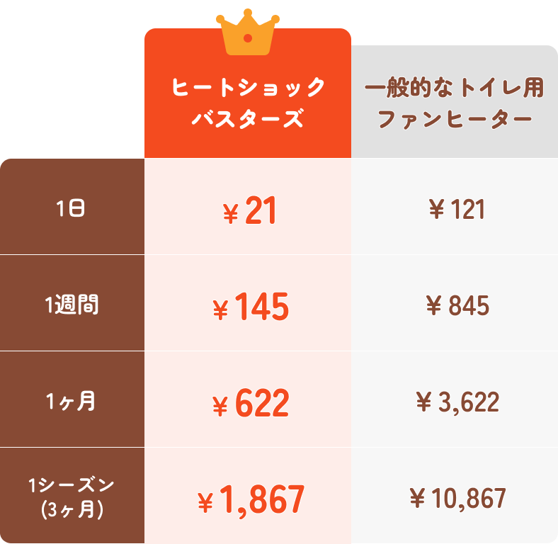 ヒートショック・バスターズの壁暖房システムは超省エネで自動温度調節機能付きだから、24時間ONでも安全・安心で大丈夫。電気代を節約しながら、冬中ずっとあたたかいトイレを維持することが可能です。